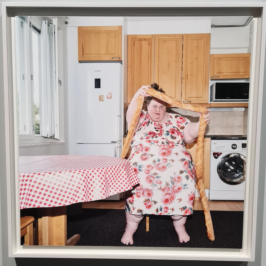Taiteilija tekee seksuaalisuudesta pilkkaa asettamalla itsensä vitsin välineeksi. Onhan hän nykynormien mukaan ”kehopositiivinen”, mutta ei tämän Suomi-neidon ylipainoaan tarvitse hävetä.