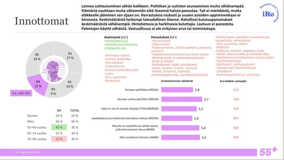 Yhteistä yli 55-vuotiaille ovat muun muassa onnellisuuden tunteet ja perhe-elämästä, matkustelusta ja hyvästä ruuasta nauttiminen. Heissä on paljon työssä viihtyviä. He pitävät vastuullisuutta ja kiertotaloutta merkityksellisinä, mutta eivät ole kirpputorien asiakkaita. He seuraavat mielellään politiikkaa ja uutisia, ovat hintatietoisia, ostavat tuotteita ja ruokaa verkkokaupoista sekä käyttävät ahkerasti digilehtiä ja sosiaalista mediaa.